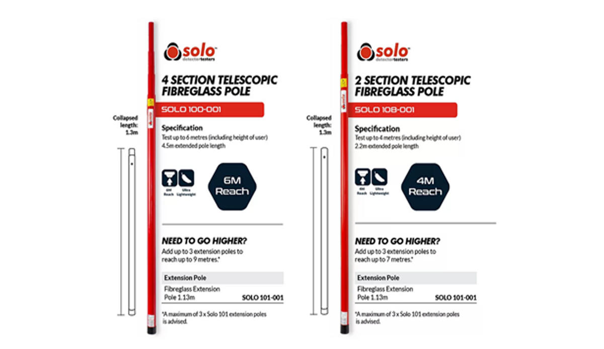 The core element of the Solo range is the telescopic and extension access poles which are extremely lightweight and quickly extend to provide access to detectors up to 9 metres. These access poles are suitable for use with both the Solo and Testifire range of detector testing products.