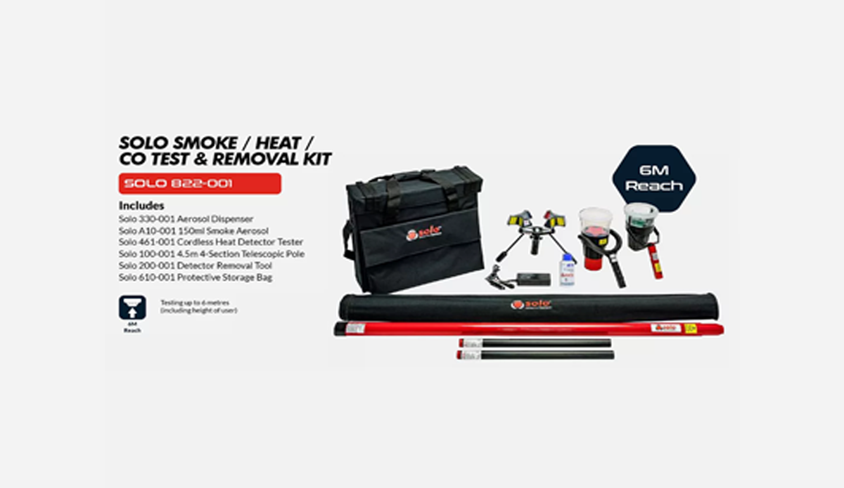 Designed to aid testing at height, the Solo 822 kit contains everything you need for safe removing and testing of both smoke and heat detectors. Solo c3 required to test CO detector.